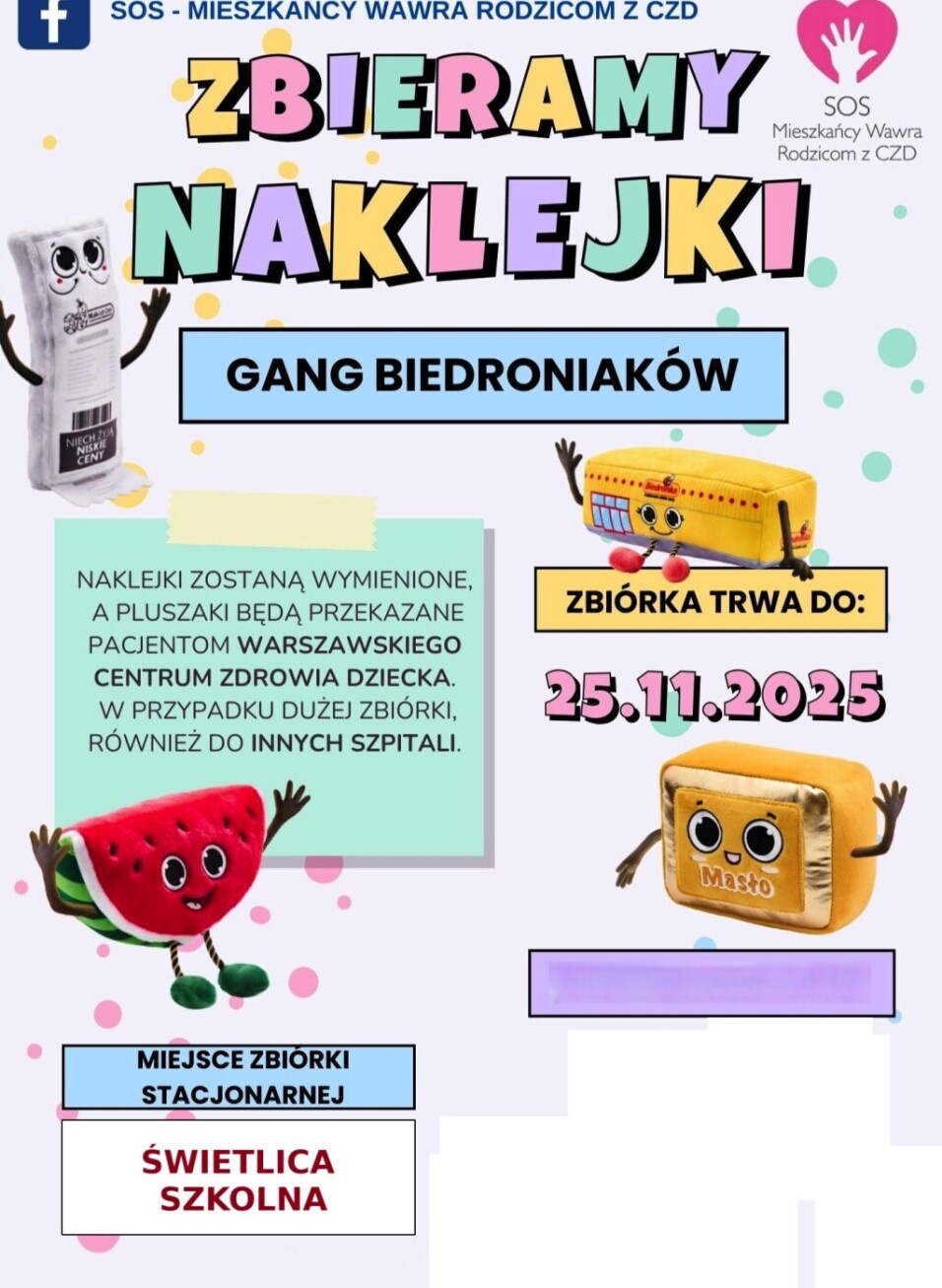 Jak co roku włączamy się w akcję organizowaną przez SOS MIESZKAŃCY WAWRA RODZICOM Z CZD. Zbieramy naklejki z marketów sieci Biedronka, które będą wymienione na pluszaki, a następnie przekazane dzieciom przebywającym w Centrum Zdrowia Dziecka. Naklejki w szkole zbiera Świetlica Szkolna. Zbiórka trwa do 25.11.205.