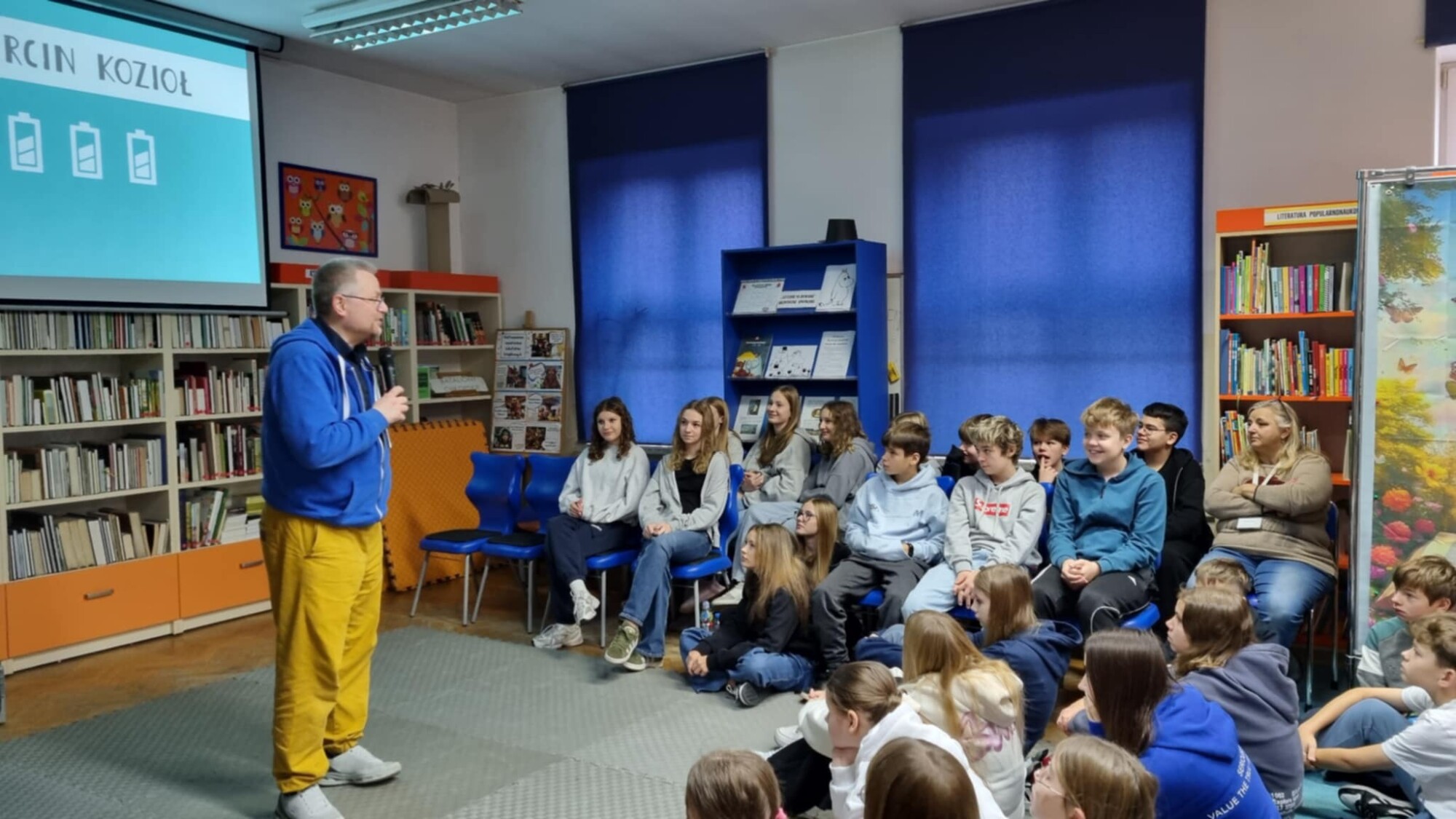 We wtorek, 2 grudnia 2025 r. w naszej szkole gościł pan Marcin Kozioł -pisarz, podróżnik, miłośnik komputerów i koni, autor popularnych książek, takich jak: „Skrzynia władcy piorunów”, „Tajemnica przeklętej harfy”, „Gwiazda Blachonosego”, „Psyjaciele”. Marcin Kozioł nie tylko ciekawie opowiadał o swoich książkach ale i urozmaicił swoją gawędę multimedialnymi atrakcjami. Były więc i filmy video o osobach i zwierzętach, które stały się ważną inspiracją przy pisaniu książek i rozwiązywanie zagadek i szyfrów przez uczestniczących w spotkaniu uczniów klas 5 i 6.