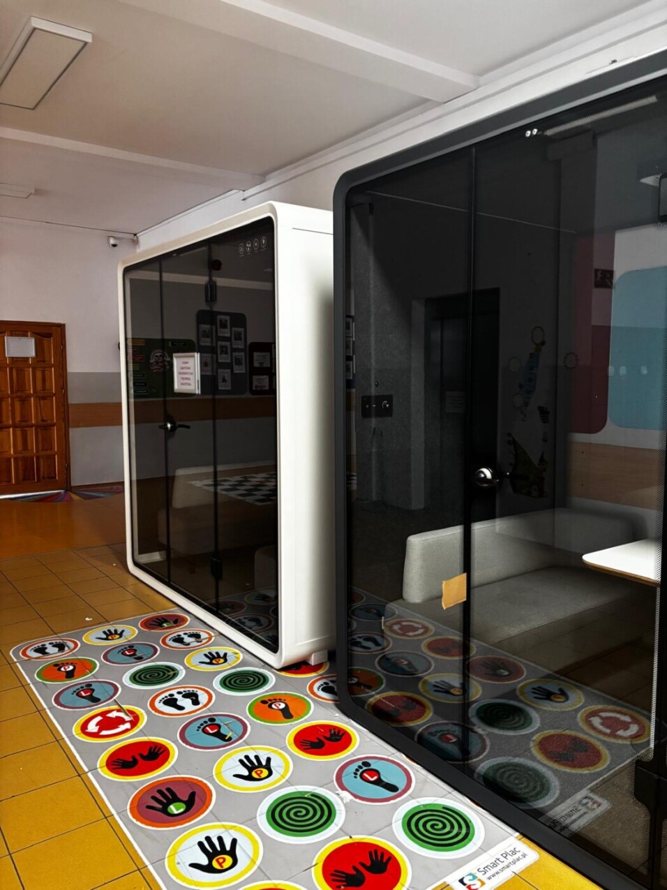 Nasza placówka w ostatnim czasie wzbogaciła się o dwie kabiny akustyczne. Kabiny akustyczne stwarzają warunki sprzyjające koncentracji podczas nauki, lektury czy odrabiania lekcji. Zapewniają przestrzeń do spokojnej pracy indywidualnej lub w małych grupach oraz gwarantują prywatność podczas rozmów z nauczycielami, psychologami czy w trakcie testów. Korzystanie z wyciszonych stref pomaga redukować stres i poprawia samopoczucie w ciągu dnia szkolnego, a jednocześnie daje możliwość odpoczynku i chwilowej izolacji od innych uczniów, co wspiera równowagę emocjonalną i efektywność nauki.